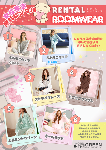 女性限定の貸出ルームウェアが新しくなりました。無料でご利用になれます。
